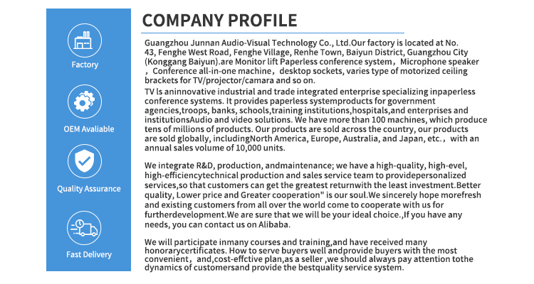 Los monitores elevadores de monitor LCD con pantalla OLED eléctricos avanzados son adecuados para todo tipo de escenas, contamos con tecnología de corte de máquina CNC y tecnología láser, la más nueva tecnología de elevador de pantalla LCD para mesa de conferencias para garantizar que el producto tenga estándares ultra altos. Todos nuestros elevadores de pantalla LCD OLED pertenecen a Made in China, están disponibles para compra al por mayor, se pueden personalizar de forma privada para los clientes y tienen suficientes elevadores de monitor LCD con pantalla táctil eléctrica en stock que admiten una entrega rápida a los clientes. Y nuestro equipo Junnan tiene una variedad de certificados como CCC, certificado CE, ROHS, certificación ISO, el producto es seguro y de alta calidad, con calificación de exportación, es una fábrica directa con precio favorable, tiene su propia fábrica y ha estado operando durante muchos años.